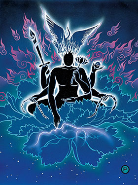 Het is de kunst om deze stilte in ons leven te laten doorklinken. Het transformatieproces tijdens de Eternal Quest gaat niet altijd gladjes. Je ziet de afbeelding van het zwaard in de ene hand en de Lotus in de andere.